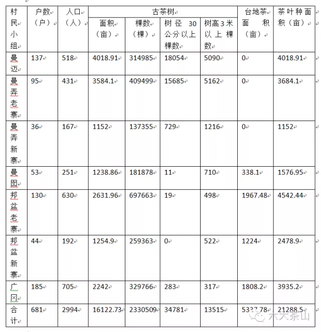 千百年來,人們似乎對賀開十分熟悉,卻又如此陌生。歷史仿佛為賀開留下一段遺憾。讓我們看一組吸引眼球的古茶樹統(tǒng)計(jì)數(shù)據(jù)吧:曼邁314985棵、曼弄老寨409499、曼弄新寨137355、曼囡181878棵、邦盆老寨697663棵、邦盆新寨259363棵、廣岡329766棵,合計(jì)2330509棵。